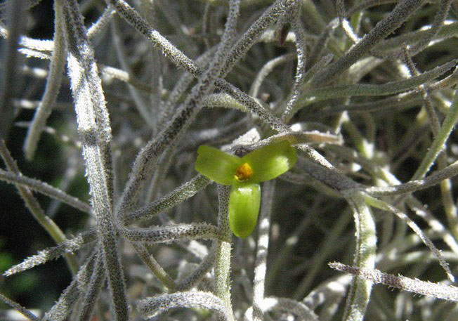 鳳梨科的植物有很多,分成50個屬,共計2600多種,我們熟悉的菠蘿就是鳳梨科的植物。空氣草,又叫空氣鳳梨、松蘿鳳梨、苔花鳳梨、老人須等等,名字很多??諝獠菔区P梨科草本植物,附生在其他植物上。它的莖、枝、葉都是線狀的,葉片上還有很多鱗片。這些鱗片是用來吸收空氣中的水分和養(yǎng)分的,而它們的根主要起固定作用。